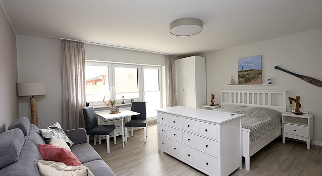 Diese neu renovierte, zentrale und sehr strandnahe Ferien-Wohnung (ca. 48 qm) mit Meerblick für 1-4 Personen verfügt über einen Wohn-/Schlafraum mit einer Sitzgarnitur (2 ½ -Sitzer-Schlaf-Couch, 2 Cocktailsessel), eine Esstischgruppe, ein Schrankbett (Liegefläche 0,90 x 2,00 m), SMART-TV und eine sehr gut ausgestattete Küchenzeile mit hochwertigem Geschirrspüler, Induktionskochfeld, Mikrowelle, Kühlschrank mit 3-Sterne-Gefrierfach etc.