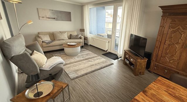 Sehr strandnah, ruhig aber dennoch zentral gelegene 2 Zimmer Wohnung ca. 40qm für 1-4 Personen. Die helle, neu renovierte Ferienwohnung verfügt über einen Eingangsflur; ein Wohn/Schlafraum mit Schlafcouch, Sessel, Kleiderschrank, Esstischgruppe, schwenkbarer LED TV 42 Zoll smart TV , Radio/CD und Internetradio ( per Bluetooth koppelbar ), Zugang zur Südterrasse mit Polyrattan Sitzgruppe, Strandkorb (nur ca. April bis Oktober ); eine separate neue Kochküche mit 4 Platten Ceranfeld, Backofen, Spülmaschine, Kaffeemaschine Toaster etc.; ein WC; Duschbad mit 90x90cm Dusche, Waschtisch und Föhn; ein Doppelschlafzimmer mit Boxspringbett 180x200cm inkl. Leseleuchten, Schiebetüren Kleiderschrank, LED 39 Zoll smart TV. Alle Fenster sind mit Duo Plisseestores zum Verdunkeln ausgestattet. Design Bodenbelag in der gesamten Wohnung. Hier steht Ihnen ein kostenloser Internetzugang Wlan zur Verfügung.