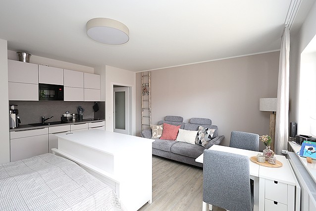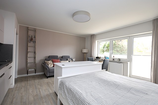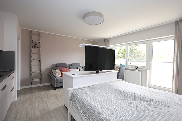 Zentral gelegenes 1 Zimmerappartement im EG für 1-2 Personen. Das modern eingerichtete Appartement verfügt über ein Eingangsflur mit Garderobe, ein Duschbad mit großer Dusche, Waschmaschine und Wäschetrockner; Wohn/Schlafraum mit Küchenzeile ( 2 Plattenherd, Mikrowelle, Spülmaschine etc.) Doppelbett, Couch und Esstischgruppe. Der TV lässt sich per elekt. Lift aus der Kommode fahren und zum Bett oder Sofa drehen. Kostenloses WLan vorhanden. Kfz-Stellplatz auf dem Grundstück. Fahrradkeller im Haus.